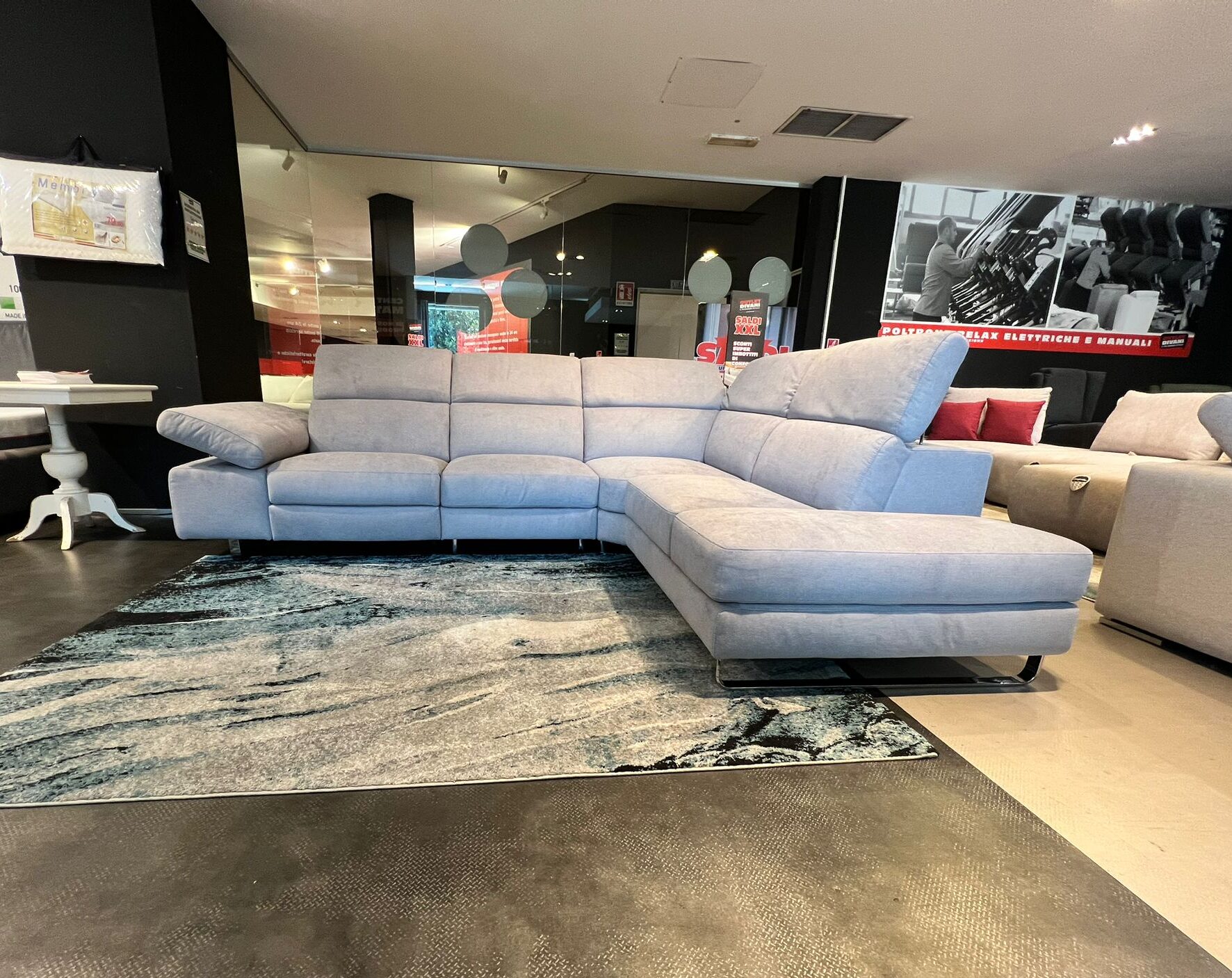 Divano angolare con seduta elettrica, piedi rialzati. Poggiatesta e bracciolo regolabili