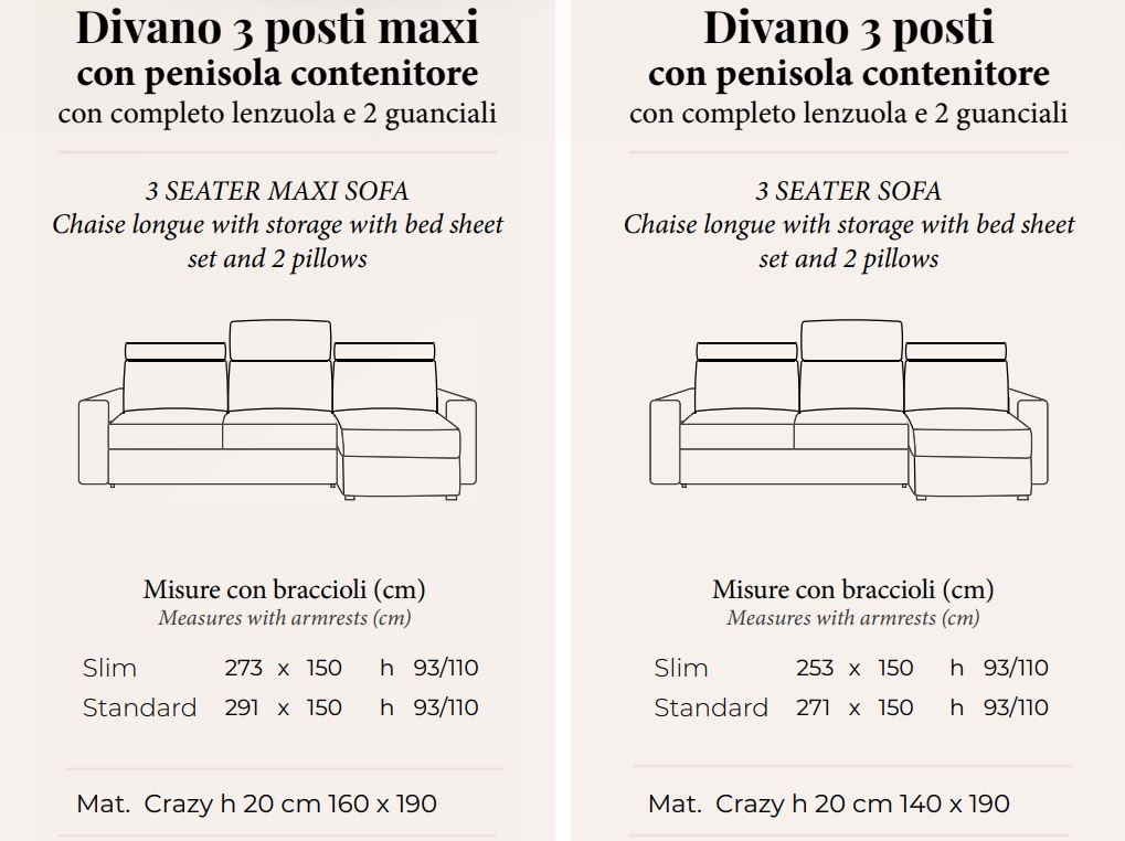 Si trasforma con estrema facilità in un comodo letto con materasso lungo 190 cm e nella parte interna dello schienale vi è un vano portaguanciali dove poter riporre