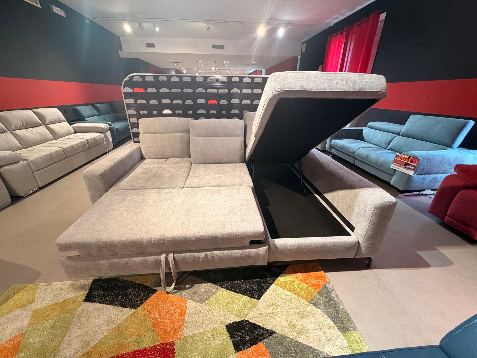 Divano con schienali traslanti, penisola angolare contenitore lettino estraibile e piedini rialzati.