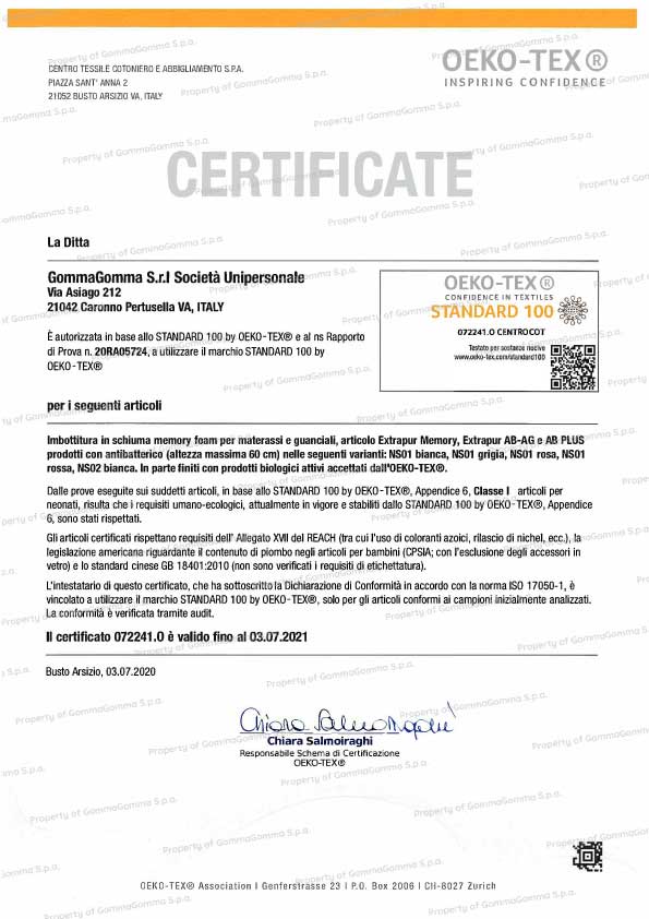 Tutti i componenti dei nostri materassi e guanciali sono certificati: dal poliuretano ed al memory della struttura interna, fino ai tessuti dei rivestimenti.