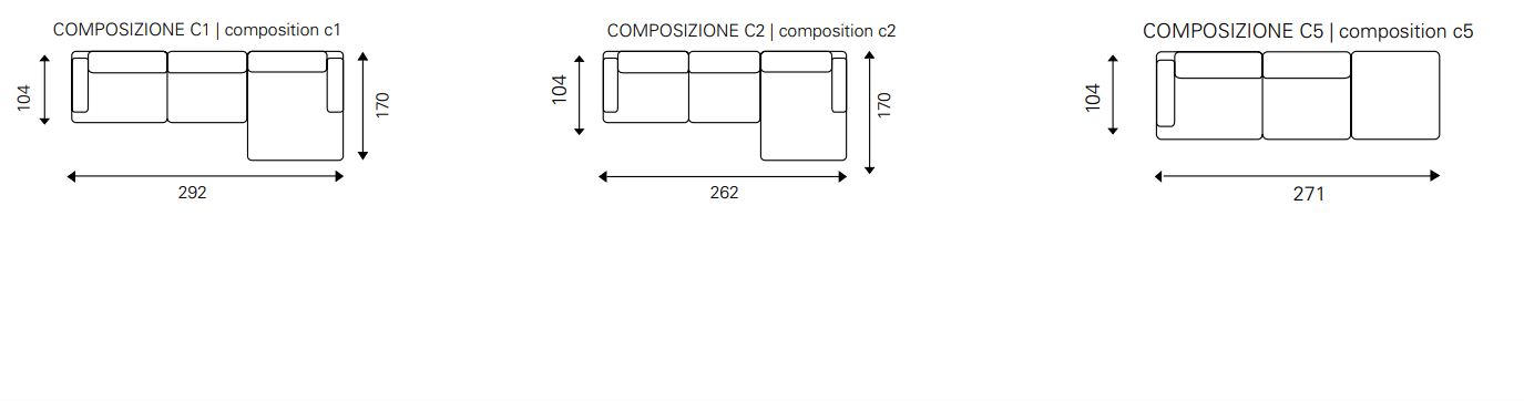 Il prezzo indicato è relativo alla composizione 3 posti l. 210 p. 104 h. 95 in tessuto categoria base