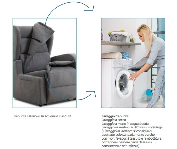 La nuova poltrona relax ti permettono di togliere in un attimo la trapunta di schienale e seduta, pulirla o addirittura lavarla, e rimetterla con estrema facilità.