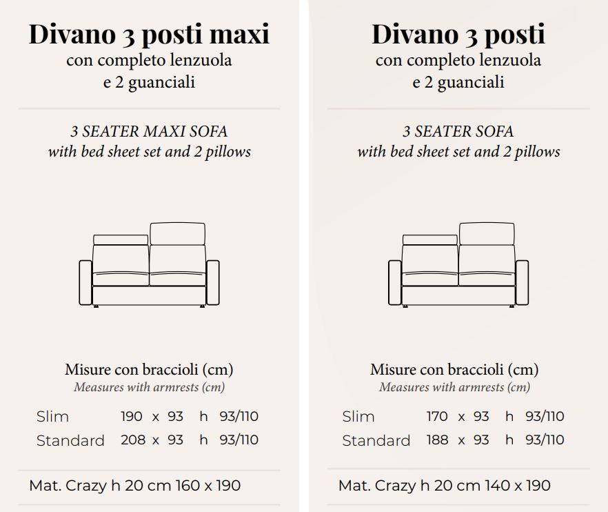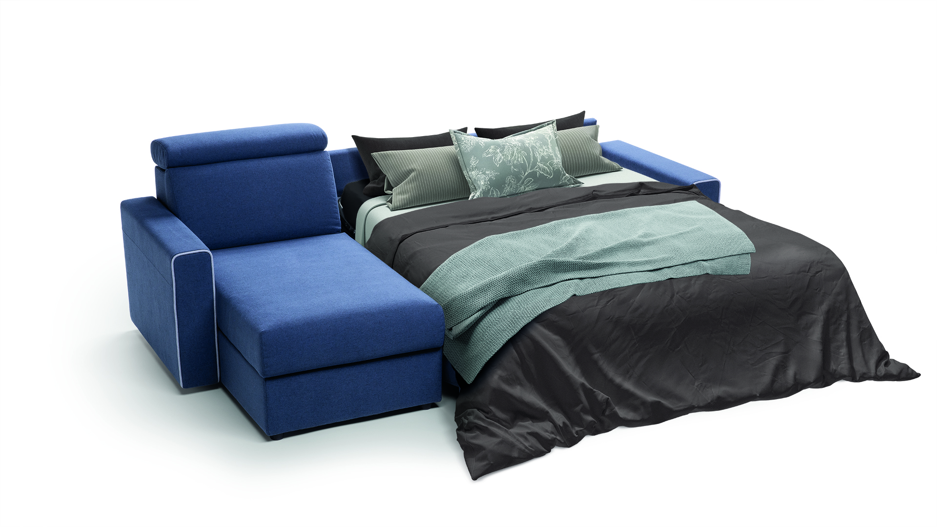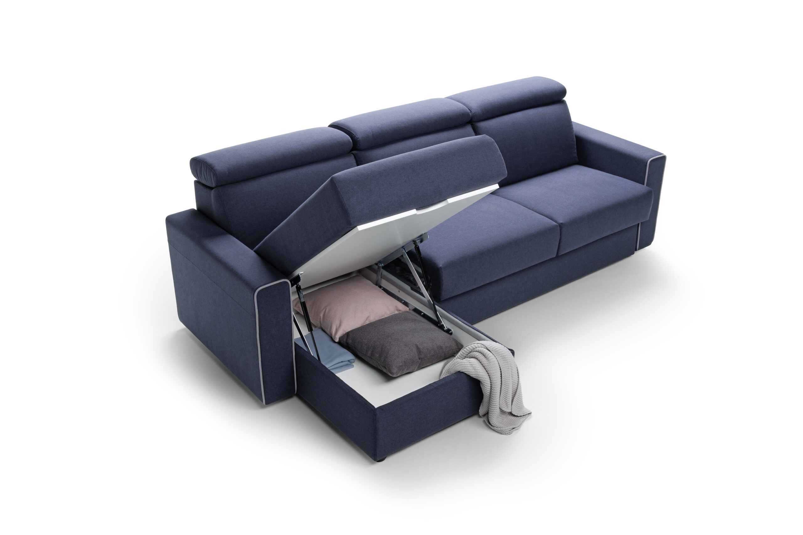 Si trasforma con estrema facilità in un comodo letto con materasso lungo 190 cm e nella parte interna dello schienale vi è un vano portaguanciali dove poter riporre